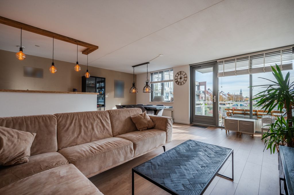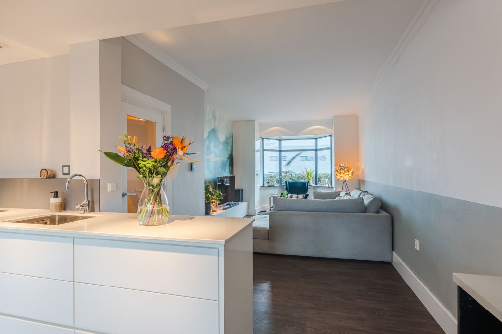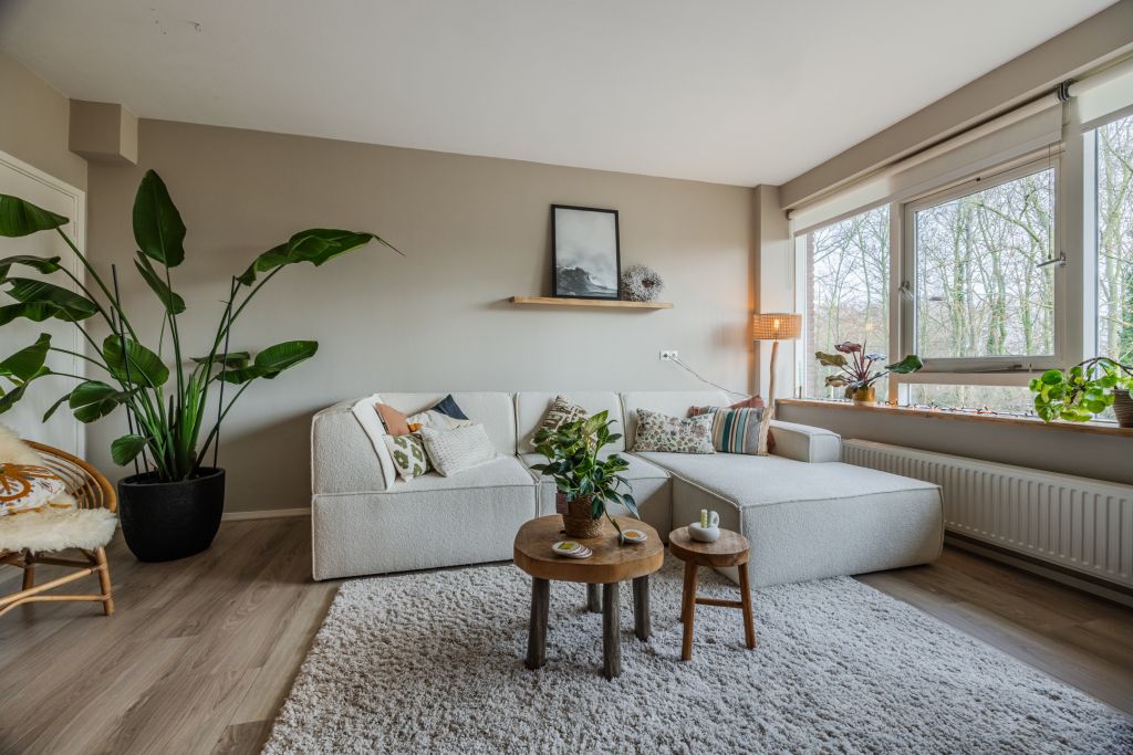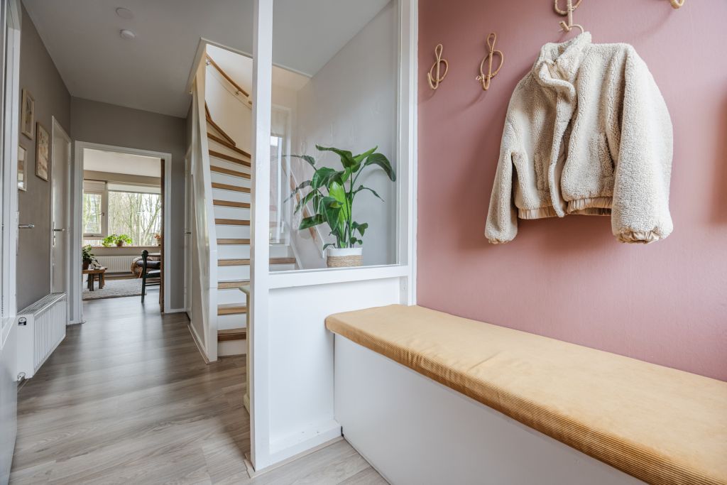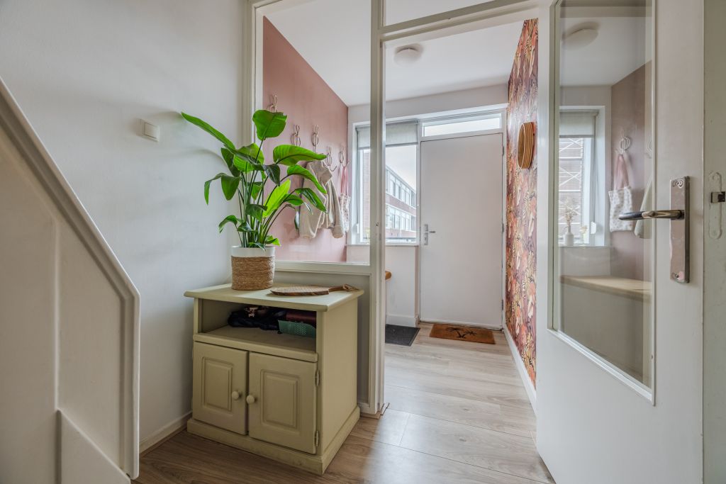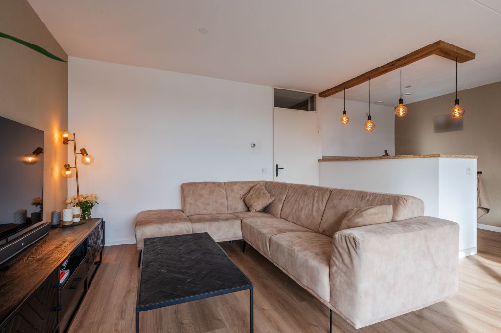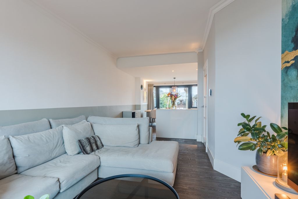 Entree aan de zijkant van de woning. Ruime hal met garderobe, meterkast en toilet met fonteintje. Toegang naar de riante L-vormige living. De woonkamer is aan de voorzijde in 2008 uitgebouwd, hierdoor is er extra veel lichtinval. Aan de achterzijde is het eetgedeelte met de open keuken in hoekopstelling. De keuken is voorzien van diverse inbouw-apparatuur. De schuifpui geeft toegang naar de achtertuin, heerlijk gelegen op het zonnige zuiden.