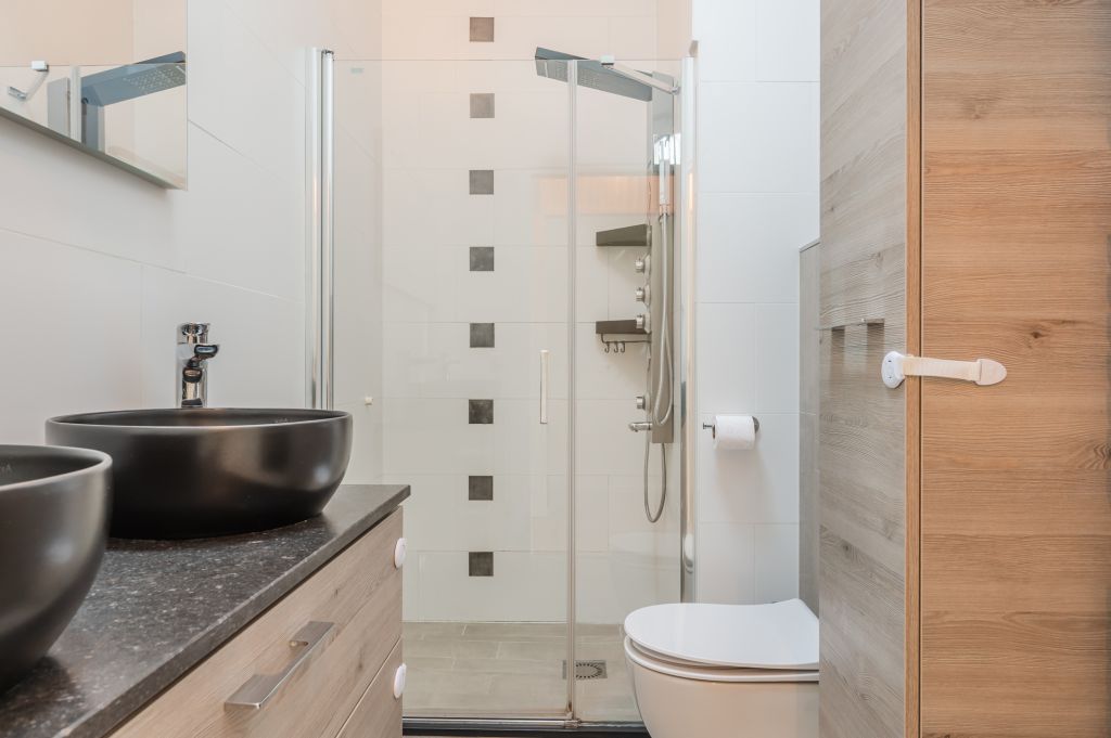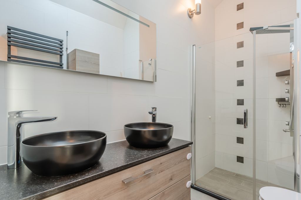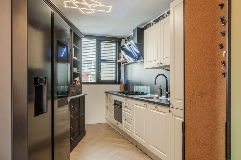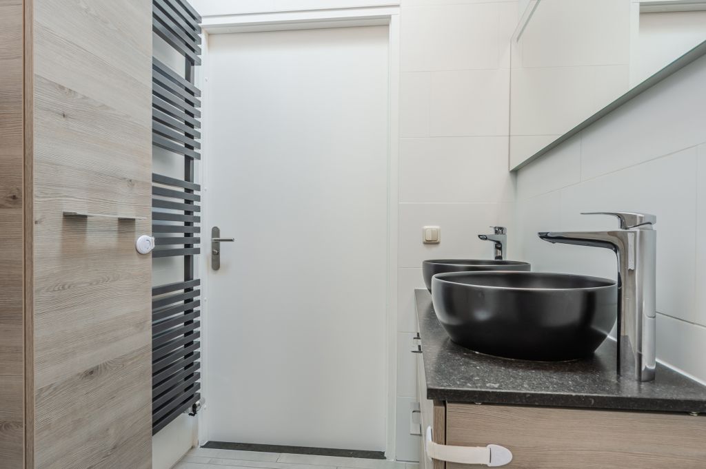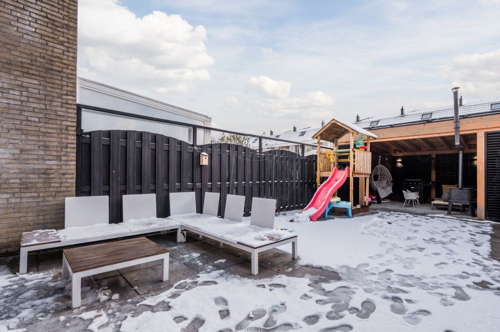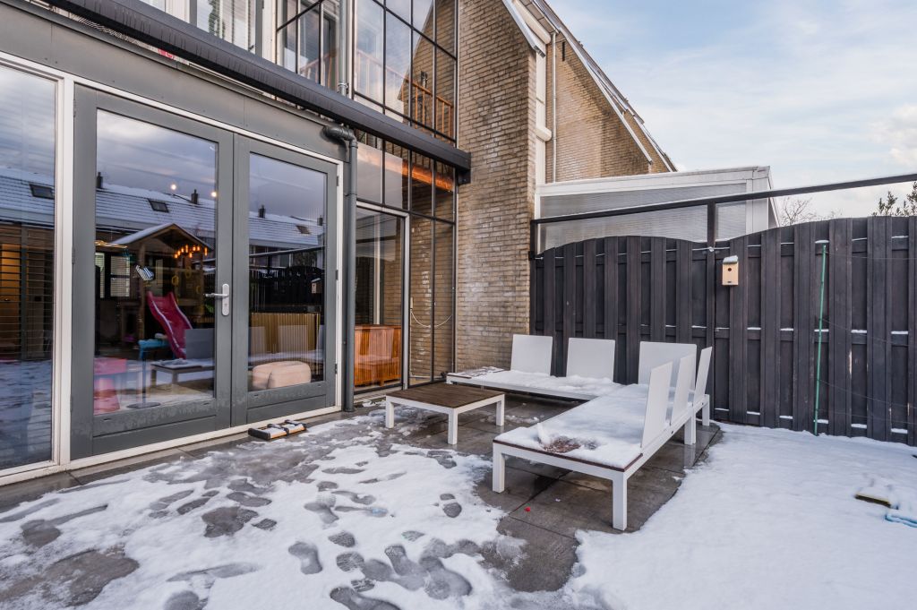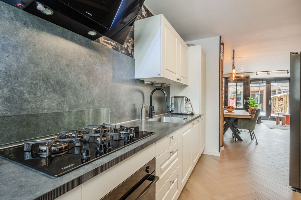 Modern toilet met fonteintje en wandcloset. De moderne badkamer is ook volledig betegeld en voorzien van een wastafelmeubel, inloopdouche en designradiator. De hoofdslaapkamer ligt aan de achterzijde, via het raam uitkijkend op uw eigen zonneterras/tuin. Entree naar de praktische woonkamer met open keuken. Via de openslaande deuren is er toegang naar de tuin met een ruim terras op het oosten. De woonkamer is strak afgewerkt en heerlijk licht. De witte hoogglans keuken is voorzien van een granieten blad en diverse inbouwapparatuur; 4-pits gaskookplaat met afzuigschouw, vaatwasser, combi-magnetron en een koelkast.
